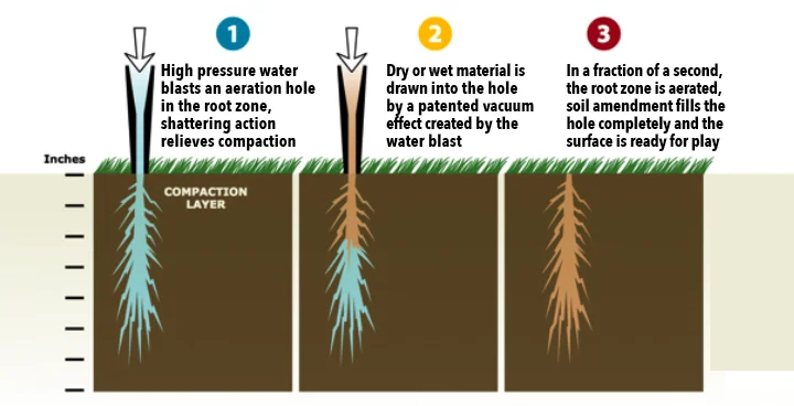 DryJect uses a high-speed, water-based injection system to blast aeration holes through the root zone to fracture the soil. The patented vacuum technology simultaneously fills holes to the surface with high volumes of sand or amendment. This means you can relieve compaction, increase water infiltration, reach the root zone with oxygen and amend your soil with high volumes of material all at the same time. Plus DryJect leaves the surface smooth and playable.
