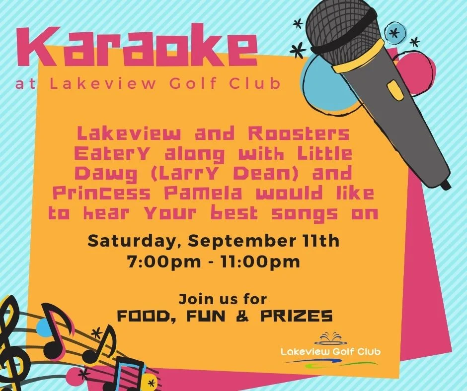Lakeview Golf Club and Roosters Eatery, along with Little Dawg (Larry Dean) and Princess Pamela want to hear your best songs for another night of Karaoke. 🎤