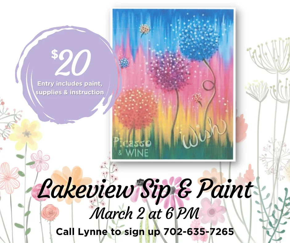 Sip N’ Paint 🎨 Join us for a fun night out painting a special picture and enjoying food and drink specials at Lakeview. The cost is $20 which includes all paint, supplies, and instruction. Sign up with Lynne at Lakeview (702) 635-7265. + Add to Google Calendar + iCal / Outlook export Date Mar 02 2022 Expired! Time 6:00 pm Category Events Share this event